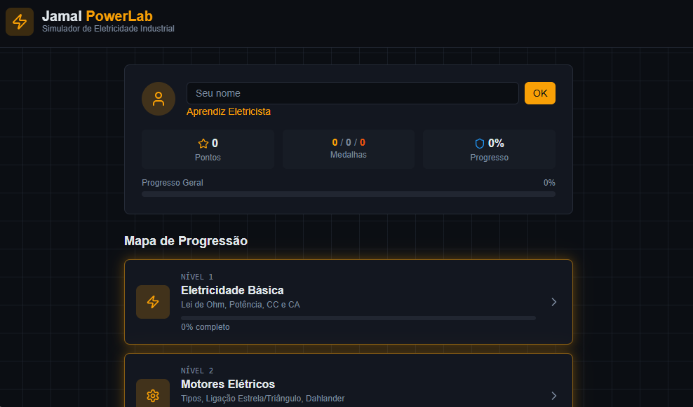 O Jamal PowerLab é um laboratório digital de Electricidade Aplicada. Desenvolva competências técnicas através de desafios progressivos e simuladores práticos.