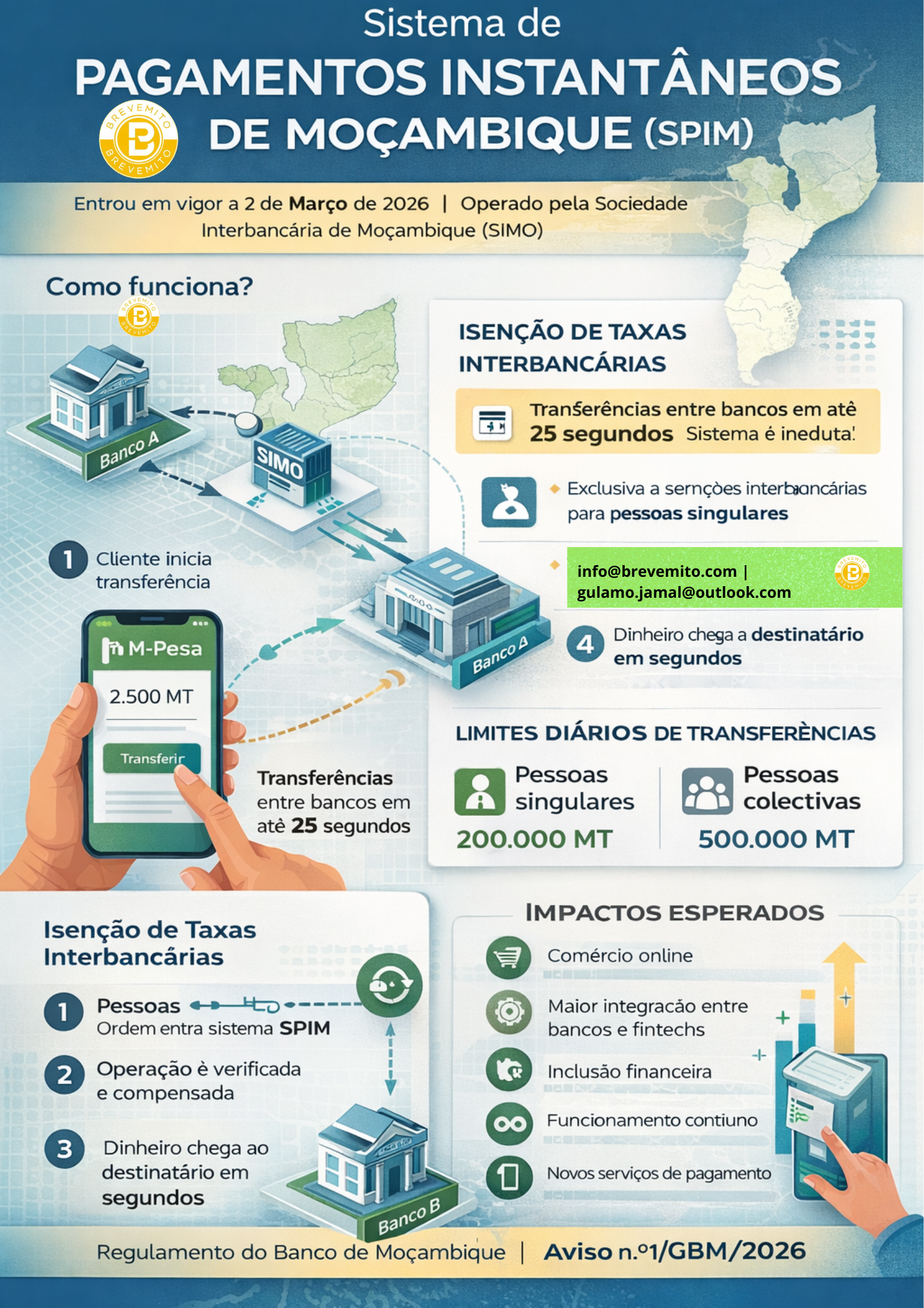 A medida foi estabelecida pelo Aviso n.º 1/GBM/2026 do Banco de Moçambique, publicado no Boletim da República, com entrada em vigor a 2 de Março de 2026. O objectivo é tornar as transferências digitais mais rápidas, eficientes e alinhadas com as boas práticas internacionais. :contentReference[oaicite:1]{index=1}